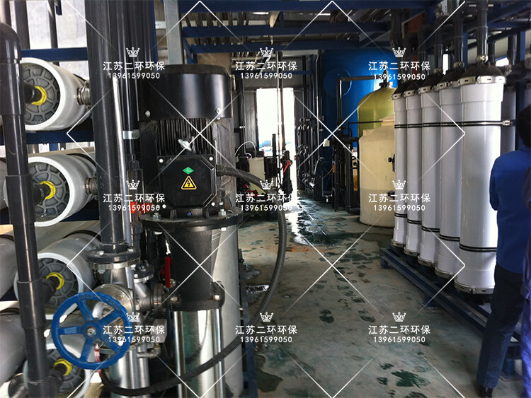 清水池→引水器→中水泵→機械過濾器(絮凝劑加藥)→活性炭過濾器(阻垢劑加藥)→增壓泵→布袋過濾器→超濾裝置→超濾水箱→超濾水箱→超濾水泵→保安過濾器→還原阻垢加藥系統→反滲透裝置→淡水箱、濃水箱(濃水處理系統)