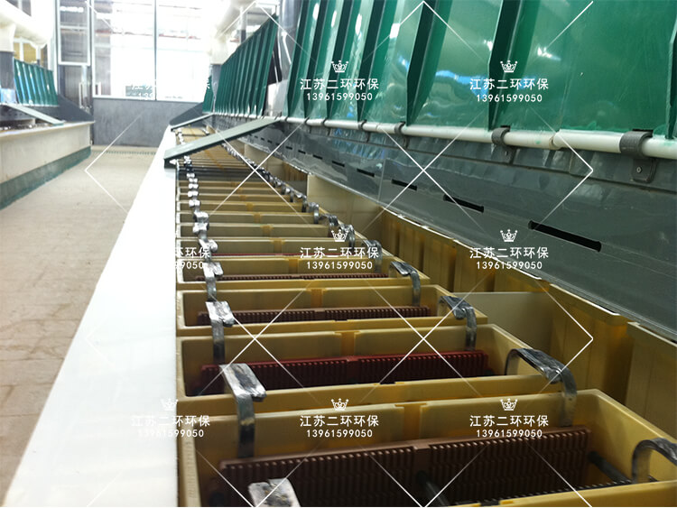 極板化成線,又稱為電池外化成酸霧回收裝置。鉛酸蓄電池的正負極板在稀硫酸中浸泡,并同時通電,進行極板外化成,生成鉛氧化物活性物質。整個系統有酸槽、酸霧吸罩,酸霧風管、酸霧凈化塔構成。類似酸洗槽、磷化槽、電解槽裝置。